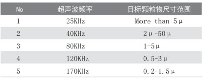 下圖是不同頻率的超聲波所能清洗去除的顆粒物范圍,40KHz的超聲波能清除的顆粒物尺寸范圍**廣,足以去除我們常見(jiàn)的大部分污垢,因此,這一頻率被廣泛使用。隨著頻率的升高,能去除的顆粒物越小,而超聲波的作用力越小。在一些對(duì)清洗的潔凈度要求較高的行業(yè),如清洗光學(xué)鏡片用于鍍膜,清洗液晶面板、清洗硅晶片等,我們通常采用多頻率多槽多步驟清洗,逐級(jí)去除顆粒。 目前市場(chǎng)上的一些變頻