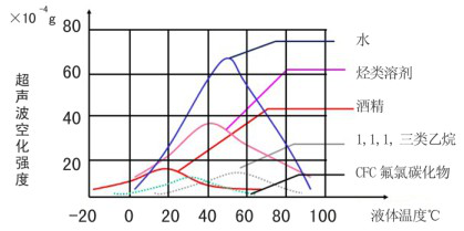 在不同的溶劑、溫度下,超聲波的空化強(qiáng)度及傳導(dǎo)效率是不同的,而空化強(qiáng)度越大,則清洗效率越高。下圖是在不同溶劑中,溫度與超聲波空化強(qiáng)度的關(guān)系,由圖看出,當(dāng)水溫在50°C左右時(shí),超聲波的空化強(qiáng)度**高。因此,用水劑進(jìn)行超聲波清洗時(shí),**佳溫度應(yīng)是40-60°C。